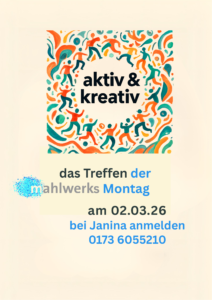 Hast Du Ideen oder Wünsche für unser kulturelles Leben in Otterndorf? Dann komme zum Mahlwerkstreffen am 13. April 2026 um 19:00 Uhr! Bitte anmelden bei Janina Stolle 0173 6055210. Diese Treffen finden einmal im Monat statt und sind der perfekte Ort, um kreative Vorschläge mit einzubringen. Wir freuen uns auch über aktive Unterstützung.
