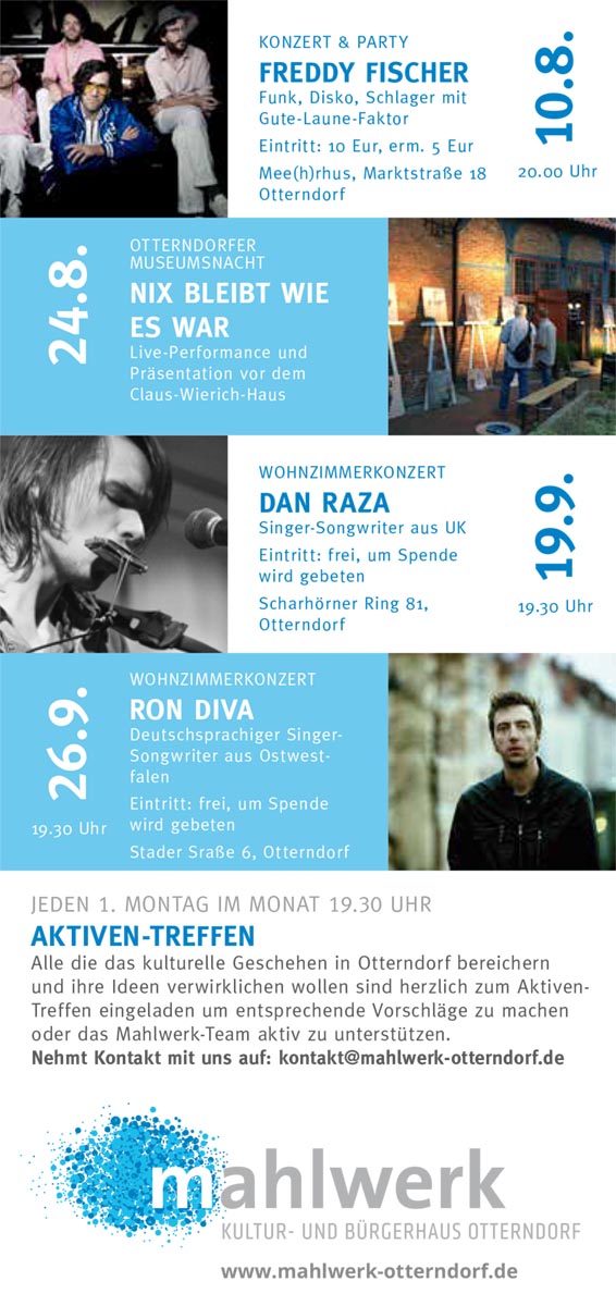 Wer es etwas ruhiger mag, kann sich schonmal den 19.9. und den 26.9. für Wohnzimmer-/Garten-Konzerte vormerken! Weiteren Infos finden Sie in dem beiliegenden Flyer und es wird natürlich noch zeitnah eine Erinnerung in Form dieses Newsletters geben.