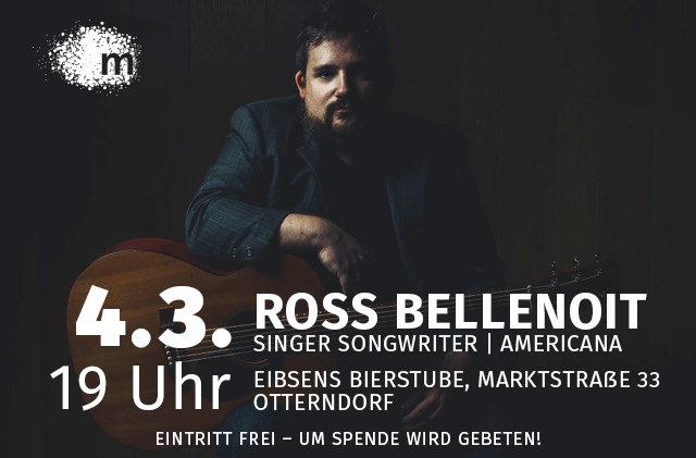 Am Mittwoch, den 4.3., begrüßen wir Ross Bellenoit. Der 37-jährige Ross Bellenoit ist ein Multi-Talent. Hierzulande ist der studierte Jazz-Gitarrist vielen als langjähriger Mann an der E-Gitarre in der Joseph Parsons Band bekannt. Nun kommt er ab Ende Februar für zwei Wochen nach Deutschland, um seiner bereits bestehenden Fangemeinde sein neues Album „Where does the light go?“, aber auch Lieder aus seinen früheren Werken zu präsentieren, und natürlich, um neue Freunde für seine Musik zu gewinnen. Das Konzert findet ab 19.30 Uhr in Eibsens Bierstube in der Markstraße in Otterndorf statt (wir öffnen um 19.00 Uhr). Eintritt ist frei – aber um eine Spende wird gebeten!